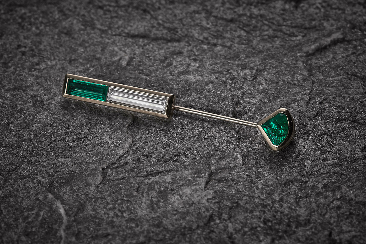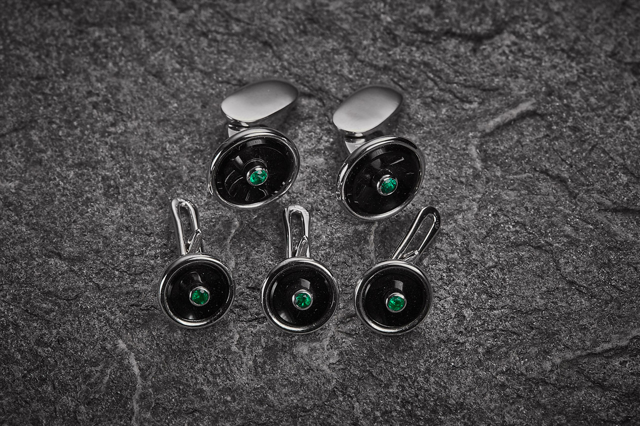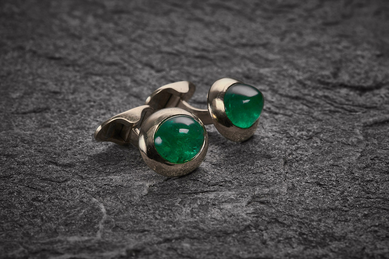 Manschetten- & Frackknöpfe - 18kt Weißgold, Onyx und Smaragde Manschettenknöpfe - 18kt Gelbgold, Smaragd Cabouchon 9,99ct Nadel - Gelbgold 18kt , Smaragd 1,16ct / Diamant 1,01ct
